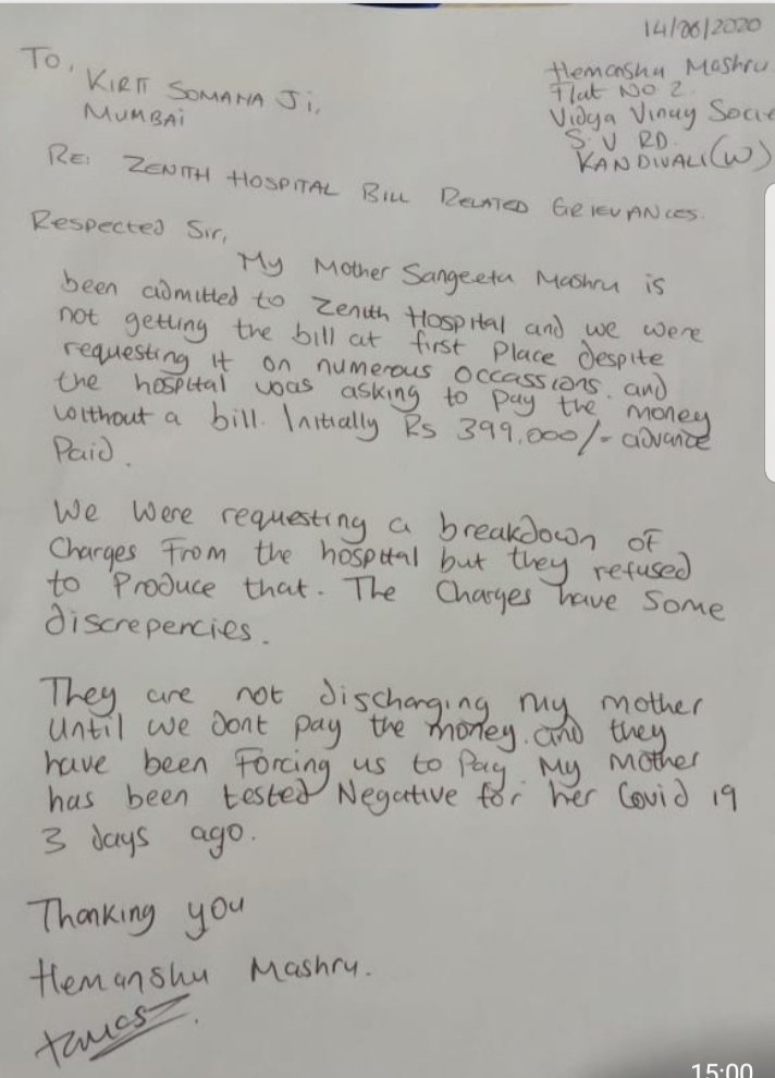 Kirit Somaiya On Twitter 1 More Loot By Private Hospital For Covid Treatment Zenith Hospital Malad Levied 500000 Additional Covid Management Consultancy Charges Hemanshu Mashru Complaint To Me Says Hospital Threatened Not To